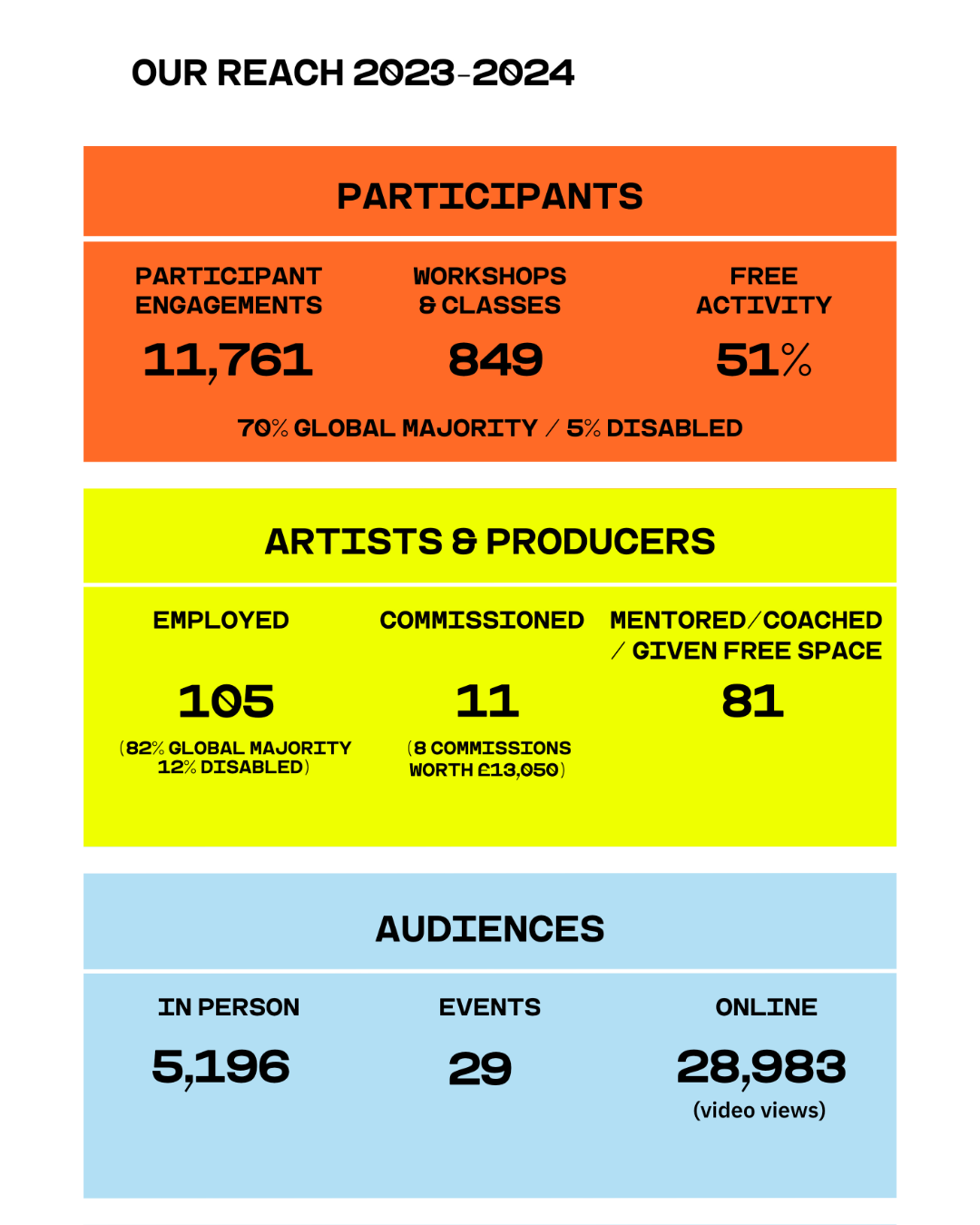 Our foundations have grown stronger this year and as a team we remain as ambitious as ever about reaching our goals and transforming access to dance, wellbeing and routes into sustainable professional careers. This year-on-year growth wouldn’t be possible without our incredible Board, staff, artist teams, and our funders. A giant Thank you to our staff, Trustees, building partner UD, all our partners and funders and of course the artists, producers and communities that we work with.