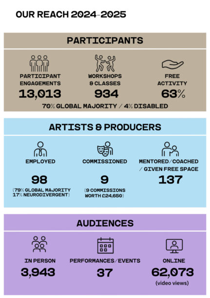 2024–25 has been a defining year for East London Dance — a period of consolidation, renewal, and looking ahead with confidence. The Talent House truly flourished, welcoming over 20,000 community visits; we launched Talent House Ignite, a major new artist development programme; our Board was strengthened with three new members – Kirsty Trujillo, Rene Germain and Tim Carter; our organisational advisory board, the Creative Collective, came into its own; and our youth programme continued to grow in ambition and impact.