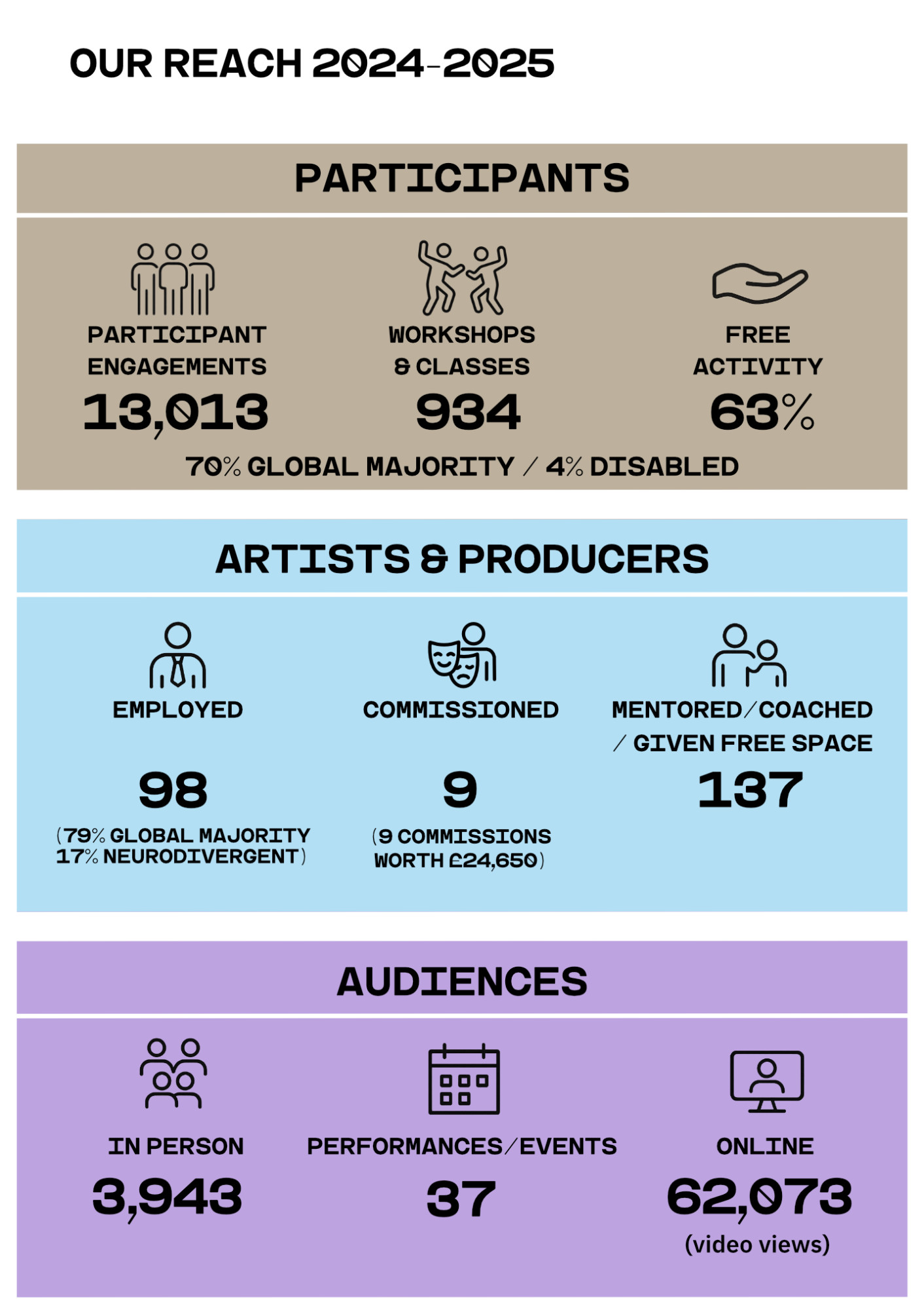 Alongside this, we focused on building a strong, values-led team; embedding wellbeing and safeguarding at every level; and creating the conditions for artists, young people and staff to thrive and develop as creative leaders.